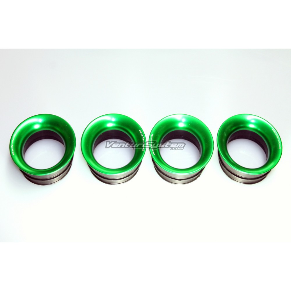 4 funis de admissão em alumínio anodizado verde, maquinados com precisão em CNC, 4 juntas de vedação e instruções de montagem.