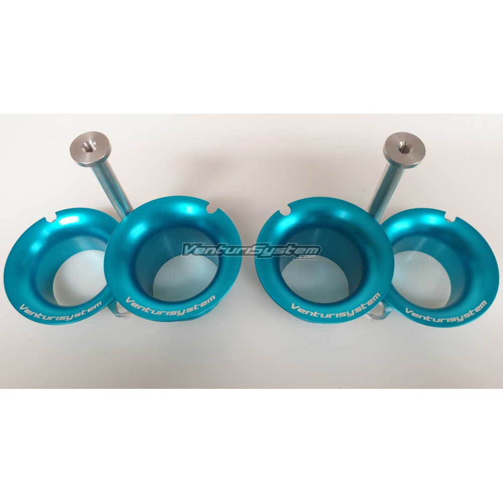 4 Racing Velocity stacks air funnel in blue anodized aluminum, mounting brackets, spacers, installation screws, and threadlocker included.